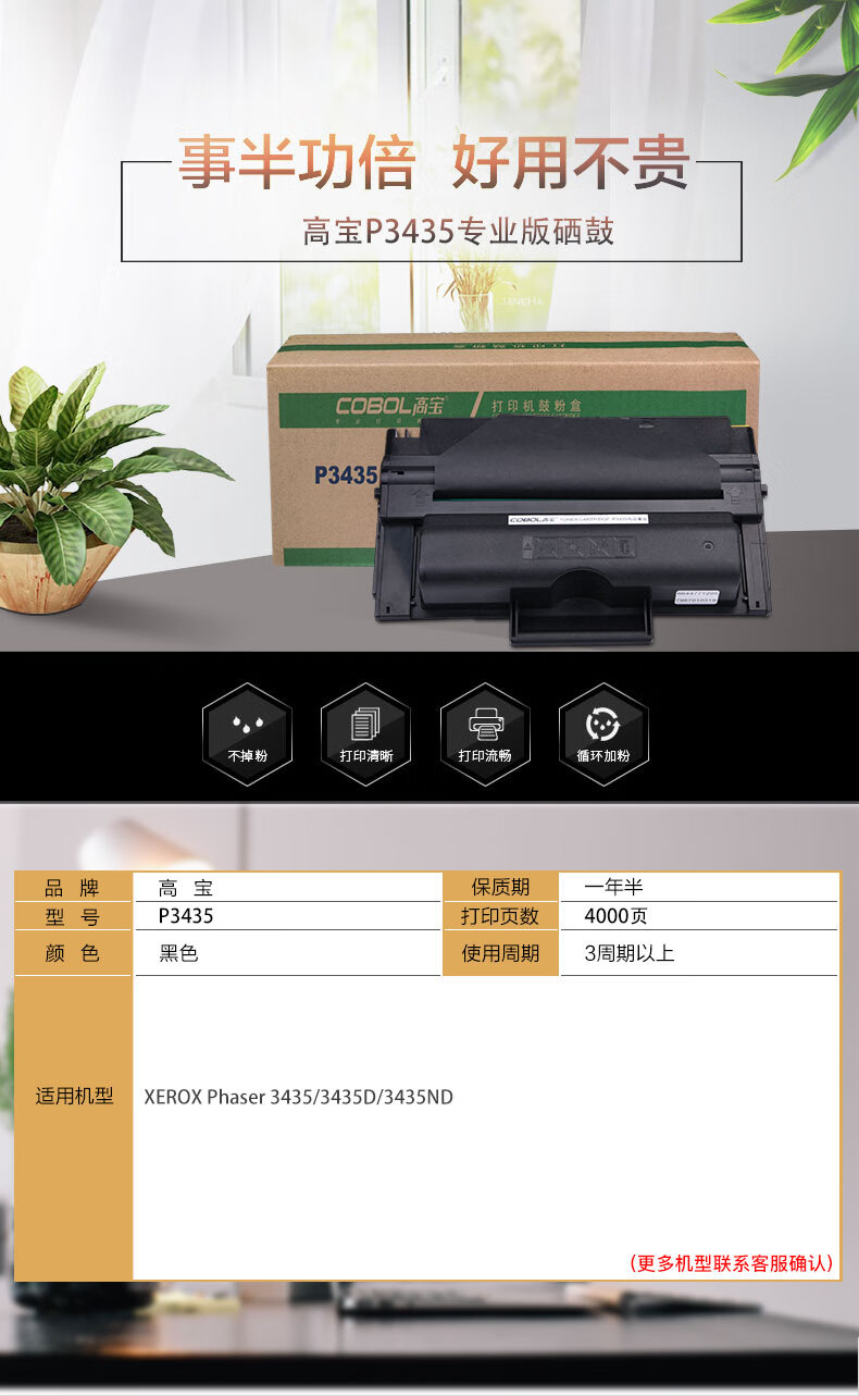 | 产品名称 : | 高宝(COBOL)P3435 专业版硒鼓 黑色适用XEROX Phaser 3435/3435D/3435ND |