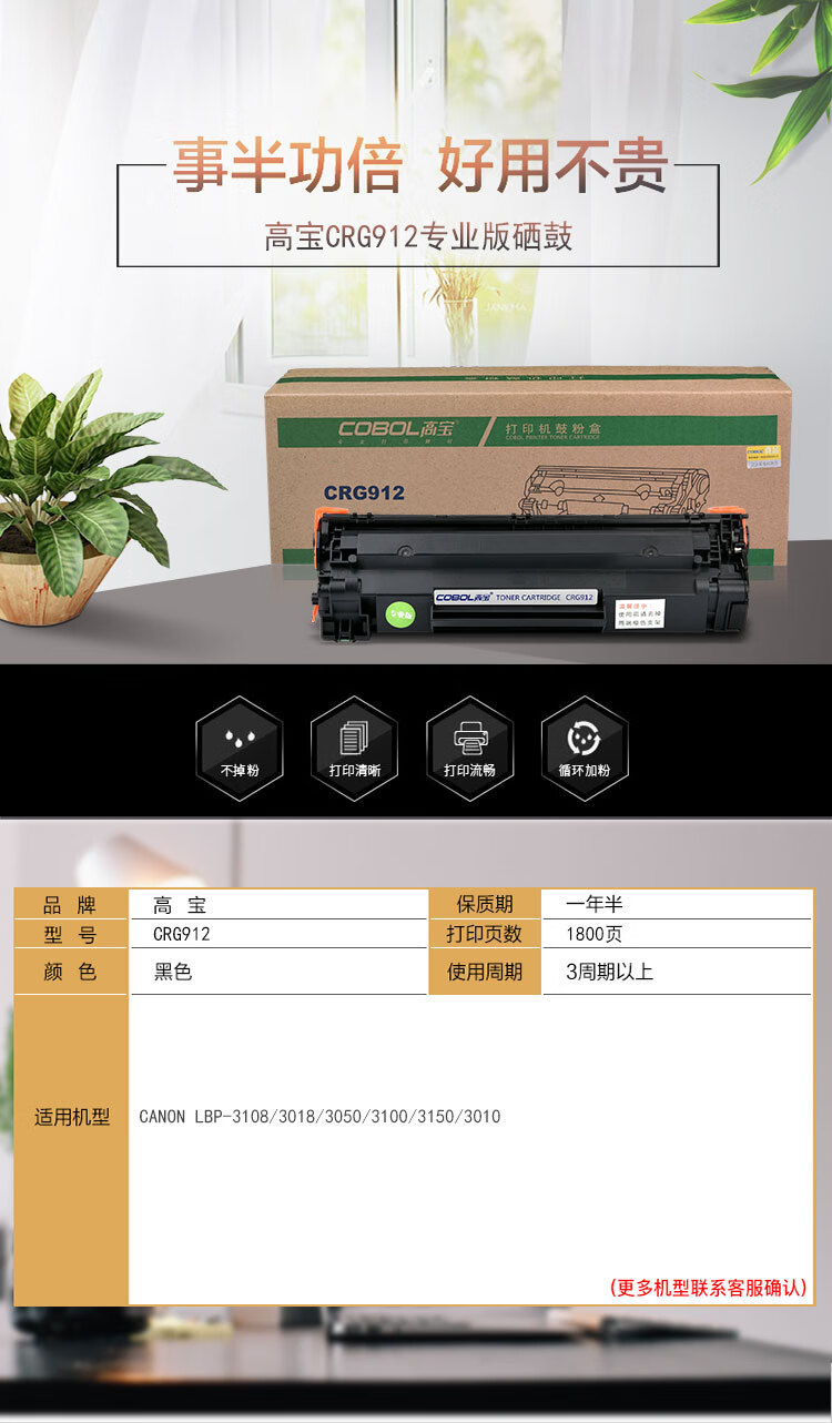 | 产品名称 : | 高宝(COBOL)CRG912 专业版硒鼓适用佳能LBP-3108/3018/3050/3100/3150/3010 |