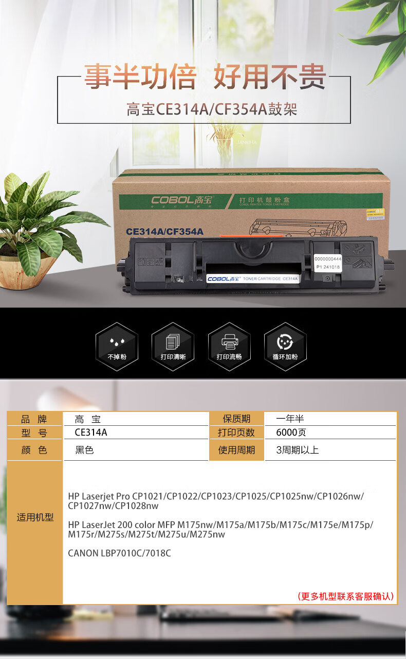 > 办公耗材 复印纸 硒鼓 > 打印耗材 > 硒鼓 > 高宝(COBOL)CE314A/CF354A专业版鼓架适用惠普CP1021/CP1022/CP1023/CP1025/CP1025nw/ 佳能LBP7010C/7018C| 产品名称 : | 高宝(COBOL)CE314A/CF354A专业版鼓架适用惠普CP1021/CP1022/CP1023/CP1025/CP1025nw/ 佳能LBP7010C/7018C |