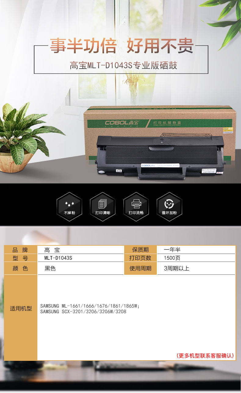 | 产品名称 : | 高宝(COBOL)MLT-D1043S 专业版硒鼓 黑色三星 ML-1661/1666/1676/1861/1865W |