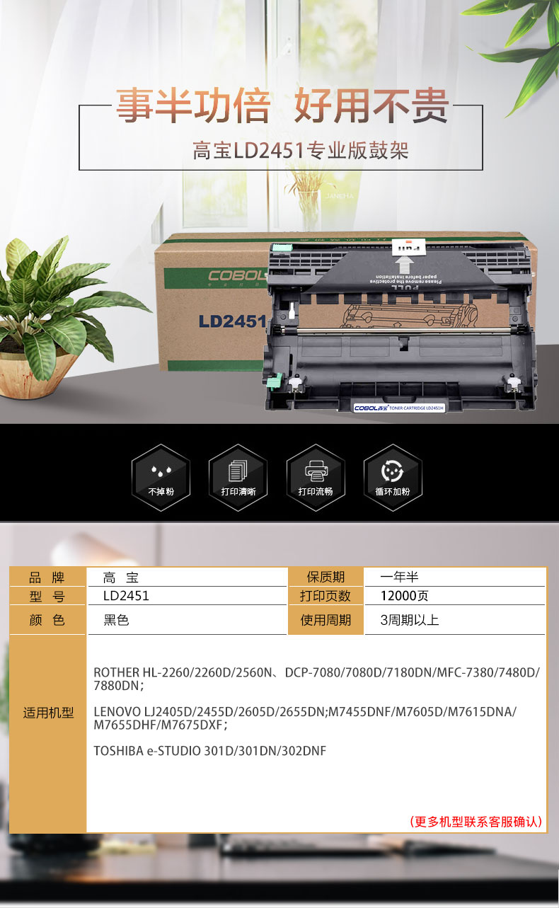 > 办公耗材 复印纸 硒鼓 > 打印耗材 > 硒鼓 > 高宝 COBOL LD2451 专业版鼓架适用ROTHER HL-2260/2260D/2560N、DCP-7080/7080D/7180DN/MFC-7380/7480D| 产品名称 : | 高宝 COBOL LD2451 专业版鼓架适用ROTHER HL-2260/2260D/2560N、DCP-7080/7080D/7180DN/MFC-7380/7480D |