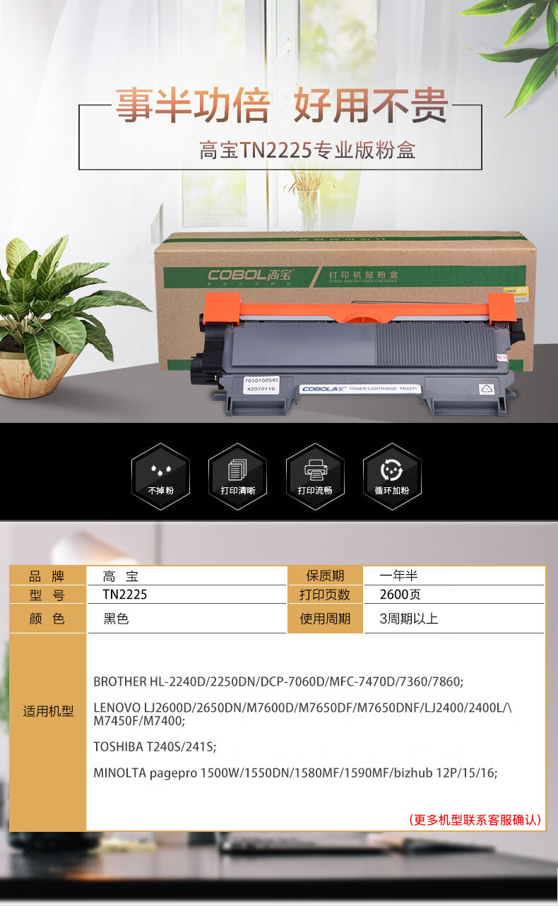 > 办公耗材 复印纸 硒鼓 > 打印耗材 > 硒鼓 > 高宝 COBOL TN2215/2225 专业版粉盒适用兄弟HL-2240D/2250DN/DCP-7060D/MFC-7470D/7360/7860| 产品名称 : | 高宝 COBOL TN2215/2225 专业版粉盒适用兄弟HL-2240D/2250DN/DCP-7060D/MFC-7470D/7360/7860 |