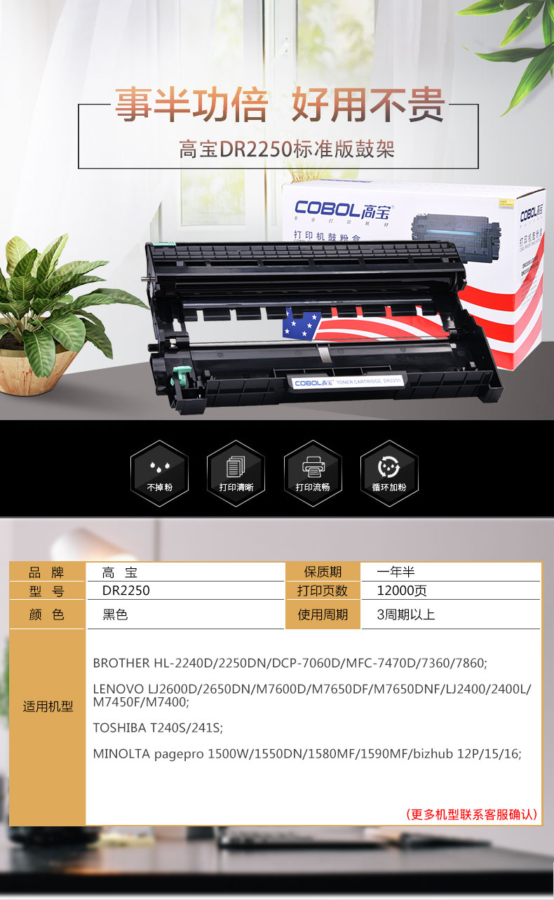 > 办公耗材 复印纸 硒鼓 > 打印耗材 > 硒鼓 > 高宝(COBOL)DR2250 标准版鼓架适用兄弟 HL-2240D/2250DN/DCP-7060D 联想LJ2600D/2650DN/M7600D/M7650DF| 产品名称 : | 高宝(COBOL)DR2250 标准版鼓架适用兄弟 HL-2240D/2250DN/DCP-7060D 联想LJ2600D/2650DN/M7600D/M7650DF |