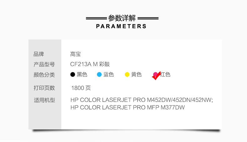 | 产品名称 : | 高宝(COBOL)CF213A 专业版硒鼓 红色适用惠普M251n/M251nw/MFP M276n/MFP M276nw |