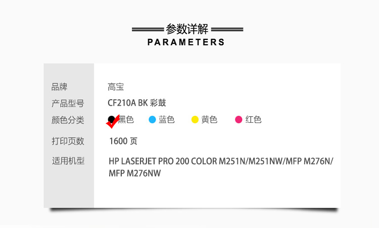 | 产品名称 : | 高宝 COBOL CF210A专业版硒鼓 黑色适用惠普M251n/M251nw/MFP M276n/MFP M276nw |