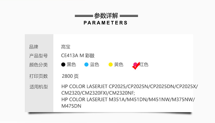 > 办公耗材 复印纸 硒鼓 > 打印耗材 > 硒鼓 > 高宝 COBOL CE413A M专业版硒鼓红色适用惠普CP2025/CP2025n/CP2025dn/CP2025x/CM2320/CM2320fxi/CM2320nf| 产品名称 : | 高宝 COBOL CE413A M专业版硒鼓红色适用惠普CP2025/CP2025n/CP2025dn/CP2025x/CM2320/CM2320fxi/CM2320nf |