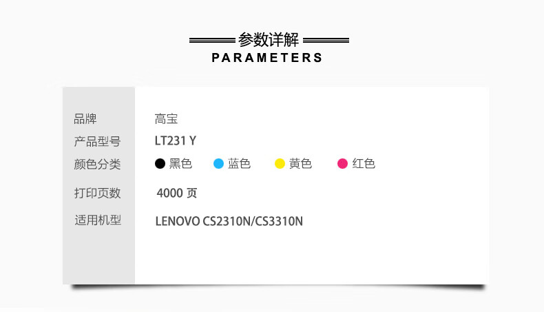 | 产品名称 : | 高宝LT231硒鼓粉盒黄色适用联想CS2310N粉盒 2310硒鼓碳粉CS3310DN打印机墨盒碳粉墨粉 |
