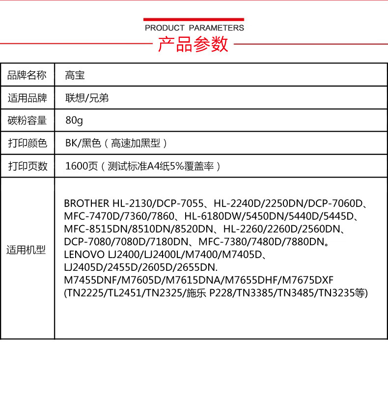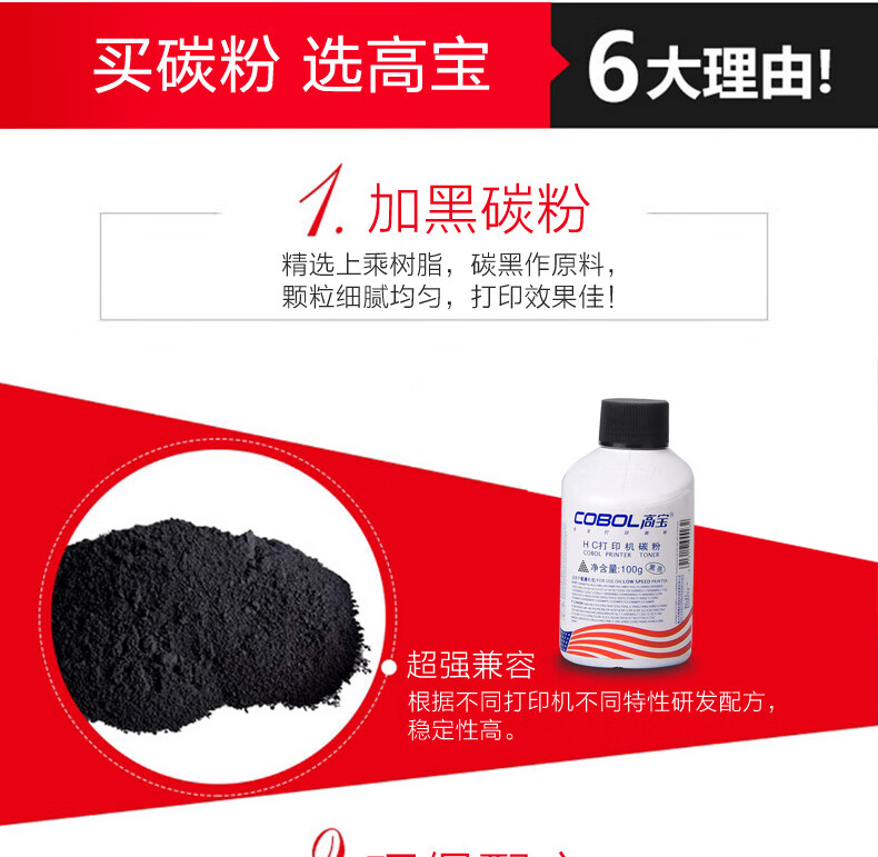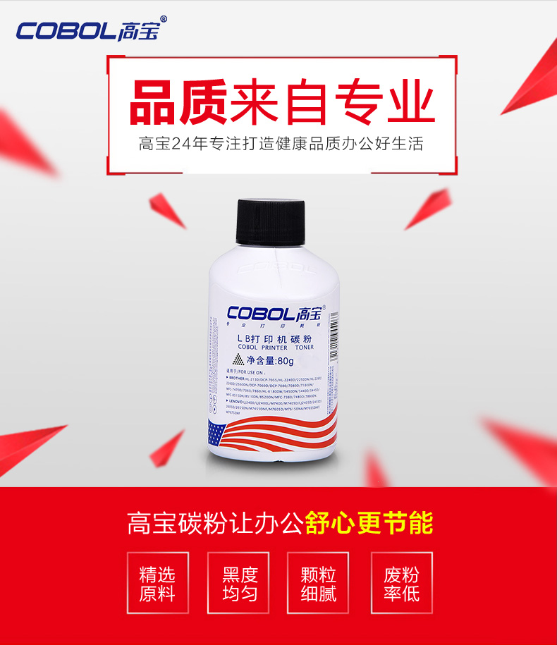 | 产品名称 : | 高宝 COBOL 联想/兄弟通用碳粉适用HL2140 7450 DCP7030 5瓶装 |