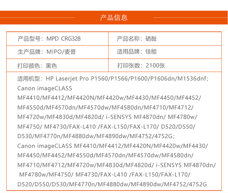 > 办公耗材 复印纸 硒鼓 > 打印耗材 > 硒鼓 > 麦普CRG328 CE278硒鼓适用惠普佳能MF4712 MF4720w MF4752 M1536 【高清版】 5支装2100页(带芯片装机即用)| 产品名称 : | 麦普CRG328 CE278硒鼓适用惠普佳能MF4712 MF4720w MF4752 M1536 【高清版】 5支装2100页(带芯片装机即用) |
