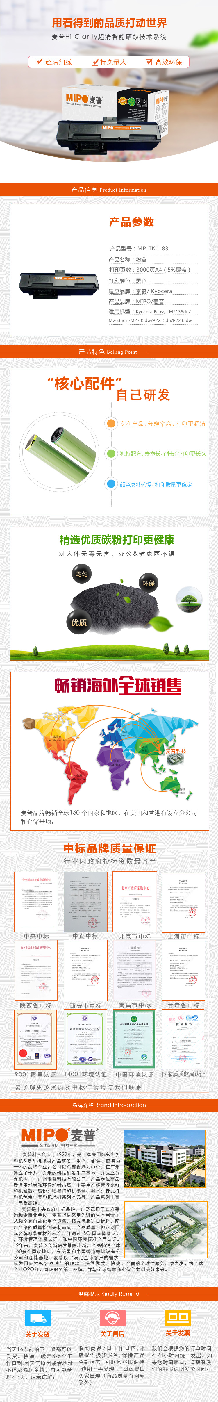 | 产品名称 : | 麦普TK1183硒鼓 政企版 适用于京瓷Kyocera ECOSYS M2135dn/M2635dn 单只装 3000页 |