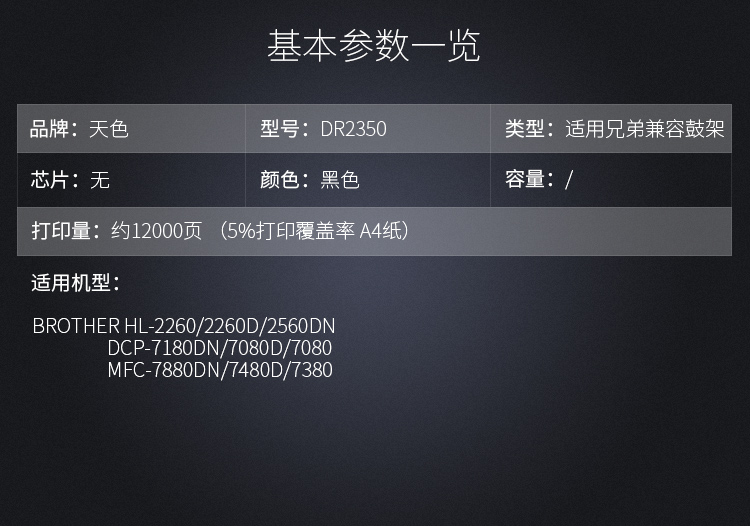 | 产品名称 : | 天色适用兄弟HL2260激光打印机硒鼓2560DN;DR2325;2312;DCP7180 |
