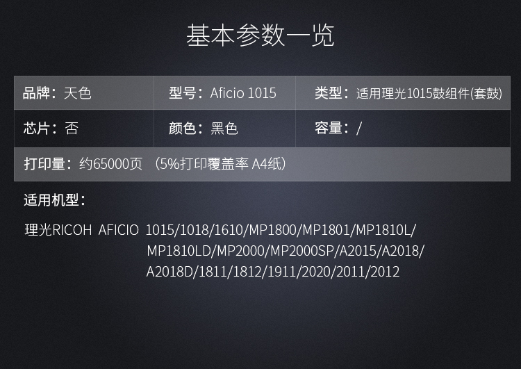 > 办公耗材 复印纸 硒鼓 > 打印耗材 > 硒鼓 > 天色适用理光1015硒鼓Aficio1018;1610感光鼓A2015;MP1800套鼓 1015感光鼓组件【送一包载体200克】 适用1822/MP1810/MP1911硒鼓| 产品名称 : | 天色适用理光1015硒鼓Aficio1018;1610感光鼓A2015;MP1800套鼓 1015感光鼓组件【送一包载体200克】 适用1822/MP1810/MP1911硒鼓 |