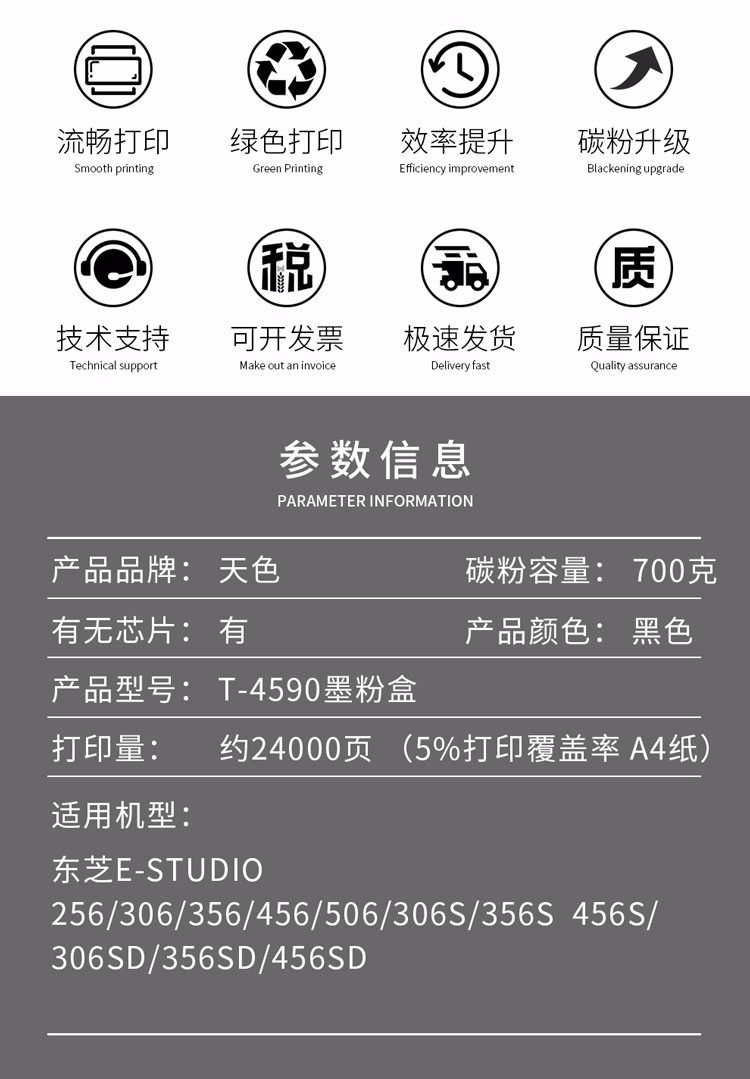 | 产品名称 : | 天色T4590粉盒适用eSTUDIO东芝306;256;356墨盒456S碳粉306SD墨粉大容量 双支装 56000页 |