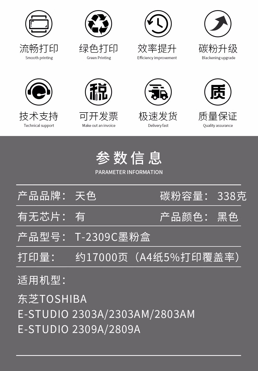 > 办公耗材 复印纸 硒鼓 > 打印耗材 > 硒鼓 > 天色大容量T-2309C粉盒适用东芝2303A墨粉T2309CS复印机2809A/AM墨盒 T-2309C大容量复合机 2支-34000页| 产品名称 : | 天色大容量T-2309C粉盒适用东芝2303A墨粉T2309CS复印机2809A/AM墨盒 T-2309C大容量复合机 2支-34000页 |