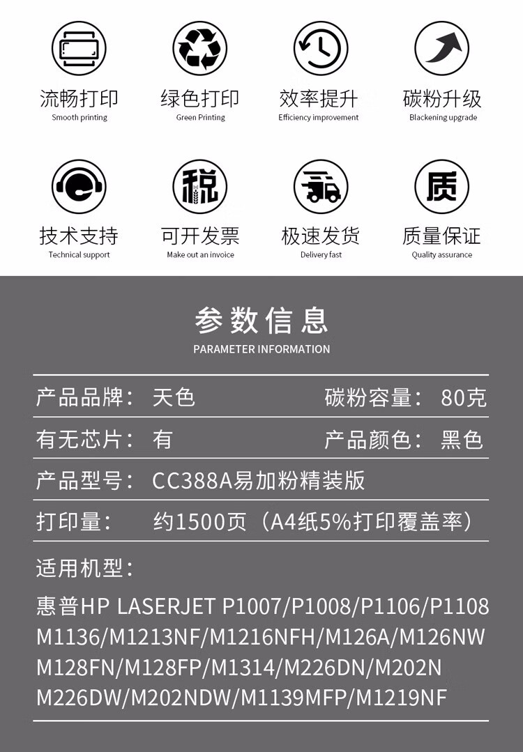 | 产品名称 : | 天色适用惠普HP LaserJet P1108墨盒P1106打印机CC388A粉盒88A 三菱高配版易加粉硒鼓-1500页 |