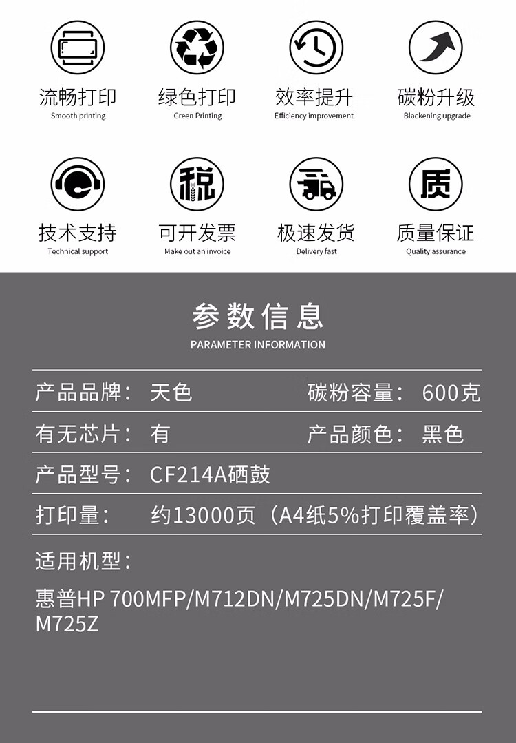 | 产品名称 : | 天色适用惠普CF214A硒鼓HP700MFP硒鼓M712DN墨盒M725dn/F/Z打印机 |