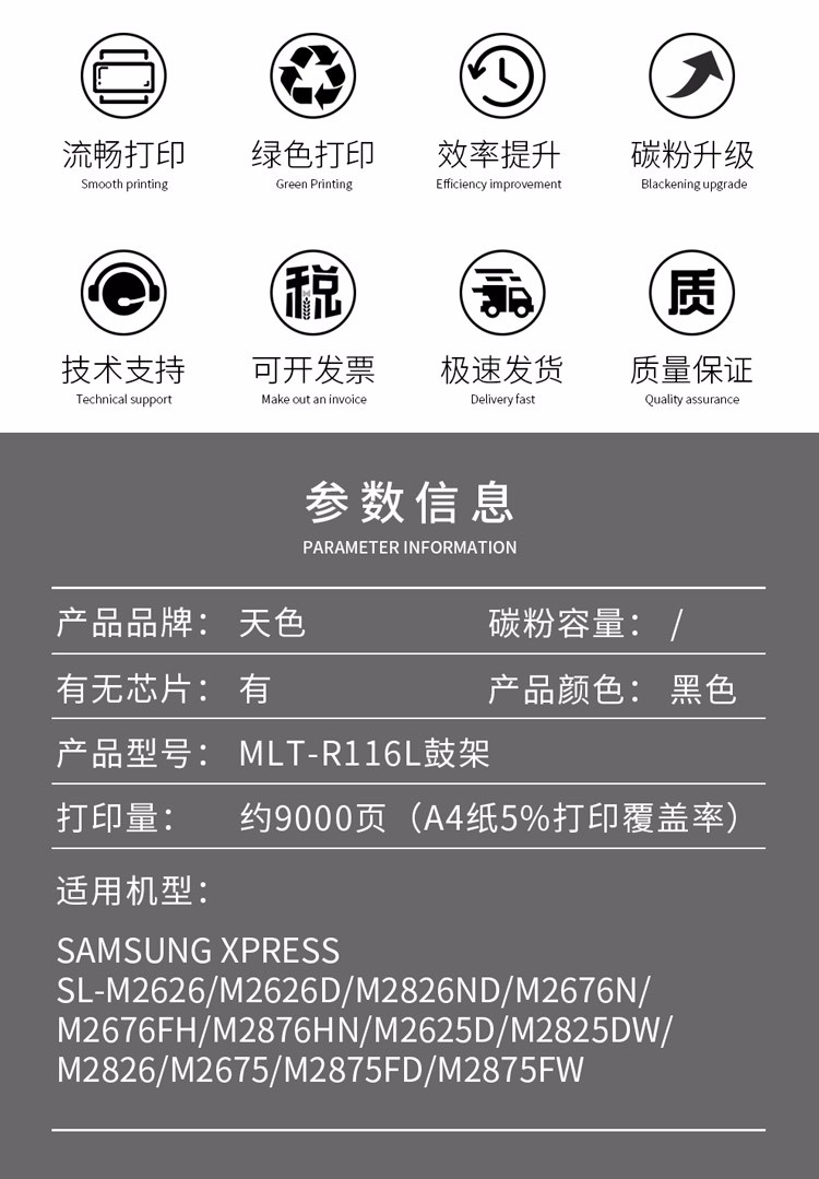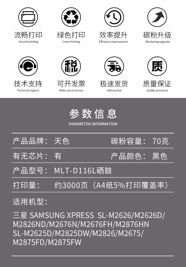 > 办公耗材 复印纸 硒鼓 > 打印耗材 > 硒鼓 > 天色适用三星M2675F粉盒M2676N墨盒M2826; M2876HN硒鼓M2626d 【企业优选】D116L标准版3000页/2支装| 产品名称 : | 天色适用三星M2675F粉盒M2676N墨盒M2826; M2876HN硒鼓M2626d 【企业优选】D116L标准版3000页/2支装 |