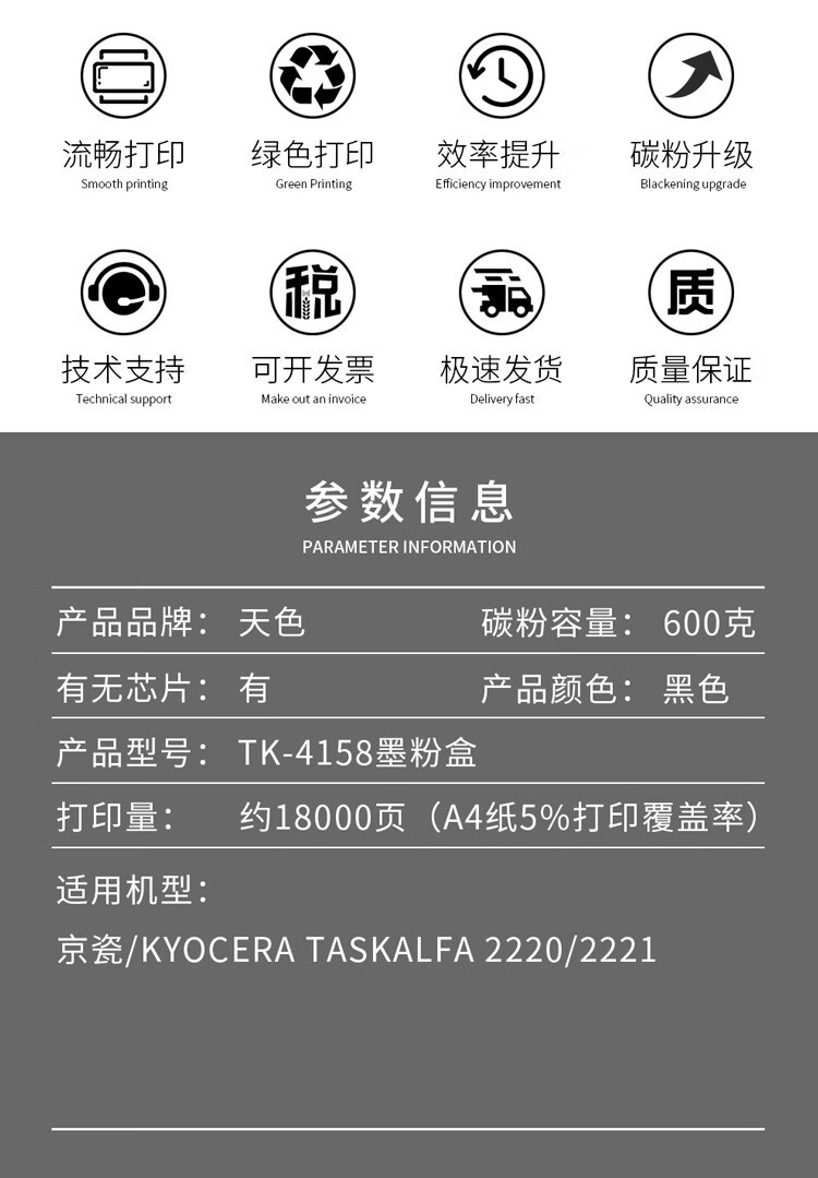 > 办公耗材 复印纸 硒鼓 > 打印耗材 > 硒鼓 > 天色TK-4158粉盒适用京瓷Kyocera TASKalfa 2220复印机墨粉盒京瓷2221墨盒 TK4158粉盒 大容量 5%覆盖率18000页| 产品名称 : | 天色TK-4158粉盒适用京瓷Kyocera TASKalfa 2220复印机墨粉盒京瓷2221墨盒 TK4158粉盒 大容量 5%覆盖率18000页 |
