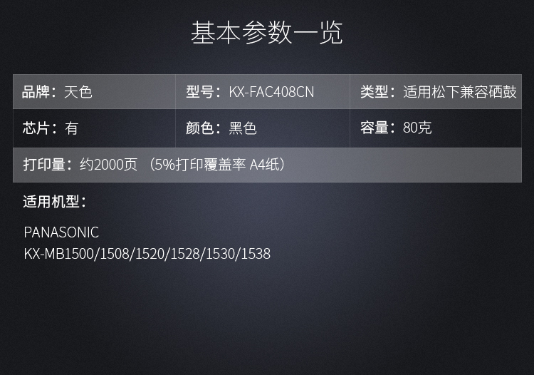 | 产品名称 : | 天色适用松下FAC408CN硒鼓FAC1528CN;1538;1558墨盒KX-MB1508CN硒鼓 FAC408CN硒鼓 |