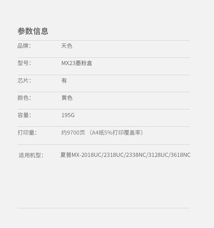 > 办公耗材 复印纸 硒鼓 > 打印耗材 > 硒鼓 > 天色 粉盒 MX23 黄色Y (适用于SharpMX-2018UC/2318UC/3128UC/MX-2338NC/MX-2638N)阳光旗舰版| 产品名称 : | 天色 粉盒 MX23 黄色Y (适用于SharpMX-2018UC/2318UC/3128UC/MX-2338NC/MX-2638N)阳光旗舰版 |