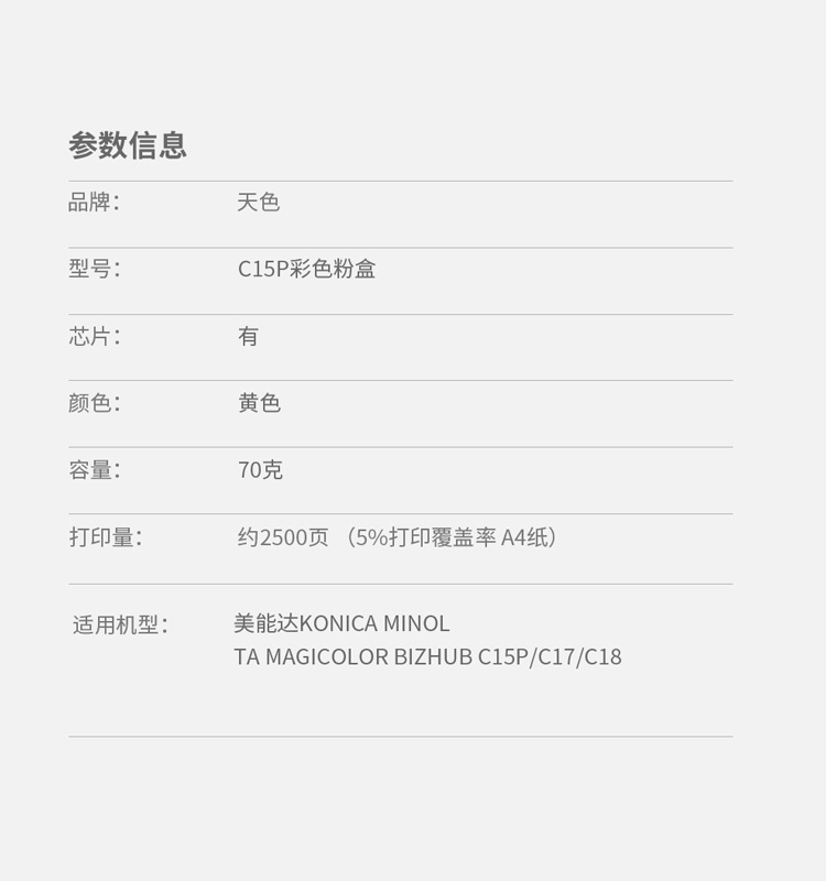 > 办公耗材 复印纸 硒鼓 > 打印耗材 > 硒鼓 > 天色 粉盒 C15P 黄色Y (适用于KonicaMinoltaMAGICOLORbizhubC15P/C17/C18)阳光旗舰版| 产品名称 : | 天色 粉盒 C15P 黄色Y (适用于KonicaMinoltaMAGICOLORbizhubC15P/C17/C18)阳光旗舰版 |