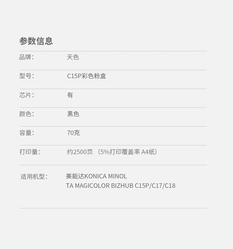 > 办公耗材 复印纸 硒鼓 > 打印耗材 > 硒鼓 > 天色 粉盒 C15P 黑色K (适用于KonicaMinoltaMAGICOLORbizhubC15P/C17/C18)阳光旗舰版| 产品名称 : | 天色 粉盒 C15P 黑色K (适用于KonicaMinoltaMAGICOLORbizhubC15P/C17/C18)阳光旗舰版 |