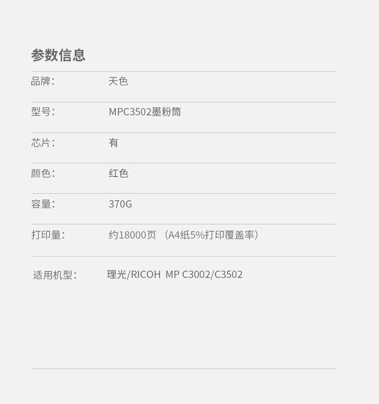 | 产品名称 : | 天色 碳粉 理光 MP C3502洋红色M (适用于RicohMPC3002/3502)阳光旗舰版 |