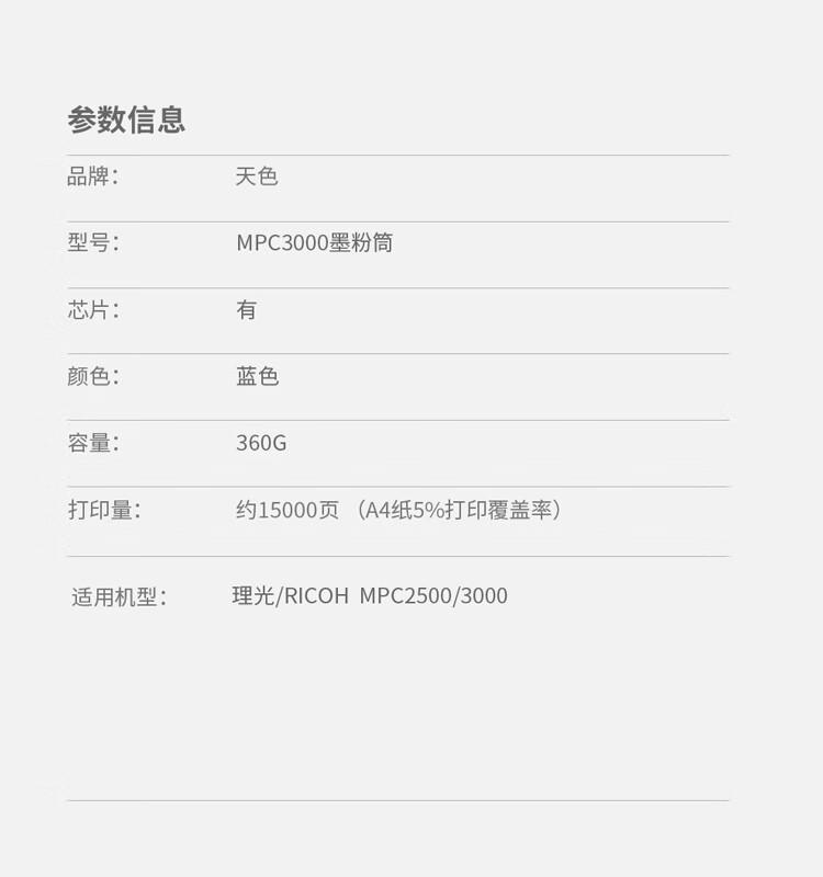 | 产品名称 : | 天色 碳粉 理光 MP C3000青蓝色C (适用于RicohMPC2500/3000)阳光旗舰版 |
