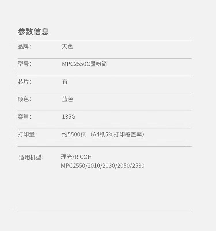 > 办公耗材 复印纸 硒鼓 > 打印耗材 > 硒鼓 > 天色 碳粉 理光 MP C2550C 215g青蓝色C (适用于RicohMPC2550/2010/2030/2050/2530)阳光旗舰版| 产品名称 : | 天色 碳粉 理光 MP C2550C 215g青蓝色C (适用于RicohMPC2550/2010/2030/2050/2530)阳光旗舰版 |