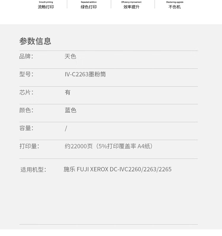 | 产品名称 : | 天色 粉盒 施乐DCC2260青蓝色C (适用于XeroxDC-IVC2260/2263/2265)阳光旗舰版 |