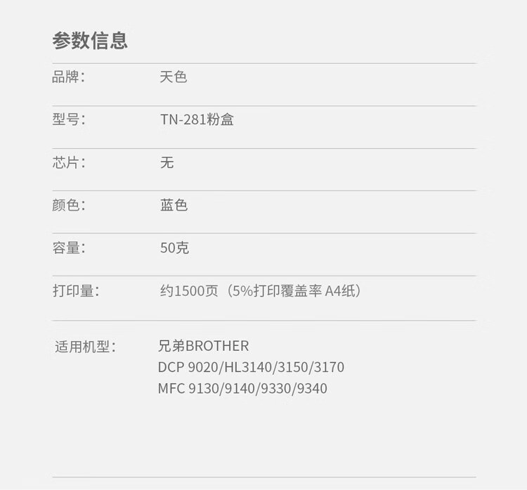 > 办公耗材 复印纸 硒鼓 > 打印耗材 > 硒鼓 > 天色 粉盒 TN281 青蓝色C (适用于BrotherDCP-9020/HL3140/3150/3170/MFC9130/9140/9330/9340)阳光旗舰版| 产品名称 : | 天色 粉盒 TN281 青蓝色C (适用于BrotherDCP-9020/HL3140/3150/3170/MFC9130/9140/9330/9340)阳光旗舰版 |