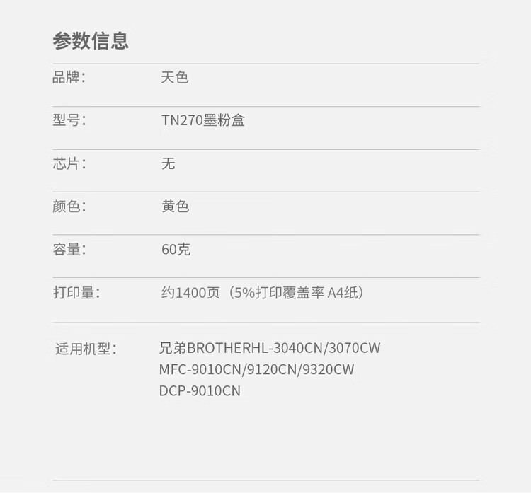 > 办公耗材 复印纸 硒鼓 > 打印耗材 > 硒鼓 > 天色 硒鼓 TN270 黄色Y (适用于BrotherHL-3040CN/3070CW/DCP-9010CN/MFC-9120CN/9320CW)阳光旗舰版 Z| 产品名称 : | 天色 硒鼓 TN270 黄色Y (适用于BrotherHL-3040CN/3070CW/DCP-9010CN/MFC-9120CN/9320CW)阳光旗舰版 Z |