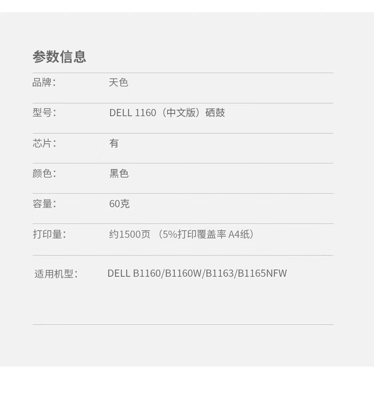 | 产品名称 : | 天色 硒鼓 B1160 易加版(适用于 DellB1160/B1160w/B1163/B1165/nfw)阳光旗舰版 |