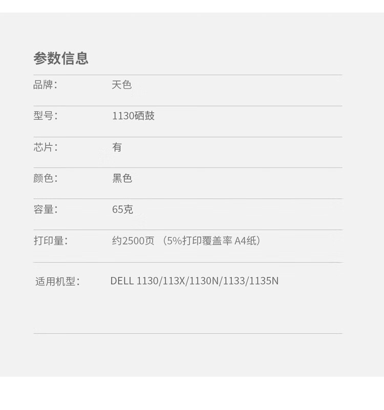 | 产品名称 : | 天色 硒鼓 1130 易加版(适用于 Dell1130/113X/1130N/1133/1135N)阳光旗舰版 |