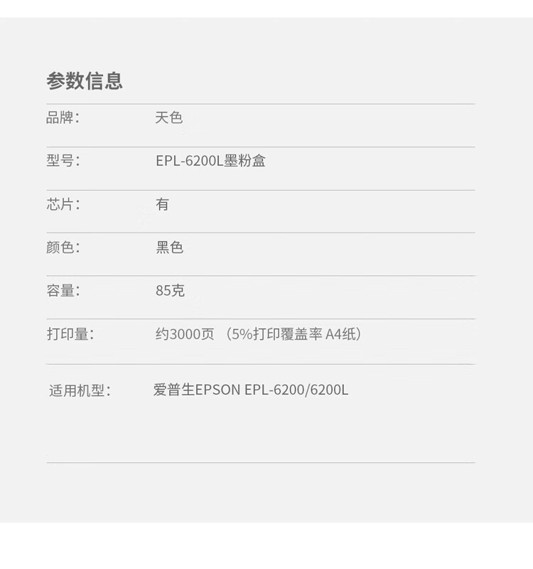 | 产品名称 : | 天色 粉盒 EPL-6200 (适用于 EpsonEPL-6200/6200L)阳光旗舰版 |