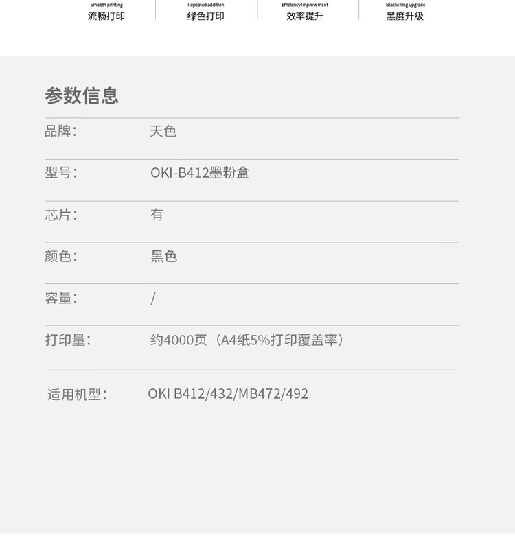产品名称 : 天色 粉盒 OKI B412 (适用于 OKI B412/432/MB472/492)阳光旗舰版