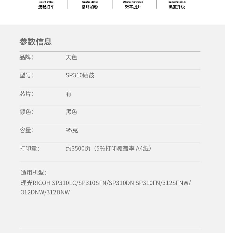 | 产品名称 : | 天色 硒鼓 兼容理光SP310(适用于 Ricoh SP310LC/)阳光旗舰版 |