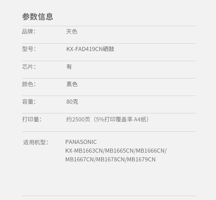 > 办公耗材 复印纸 硒鼓 > 打印耗材 > 硒鼓 > 天色 硒鼓 FAD419 (适用于 PanasonicKX-MB1663CN/MB1665CN/MB1666CN/MB1667CN/MB1678CN)阳光旗舰版 Z| 产品名称 : | 天色 硒鼓 FAD419 (适用于 PanasonicKX-MB1663CN/MB1665CN/MB1666CN/MB1667CN/MB1678CN)阳光旗舰版 Z |