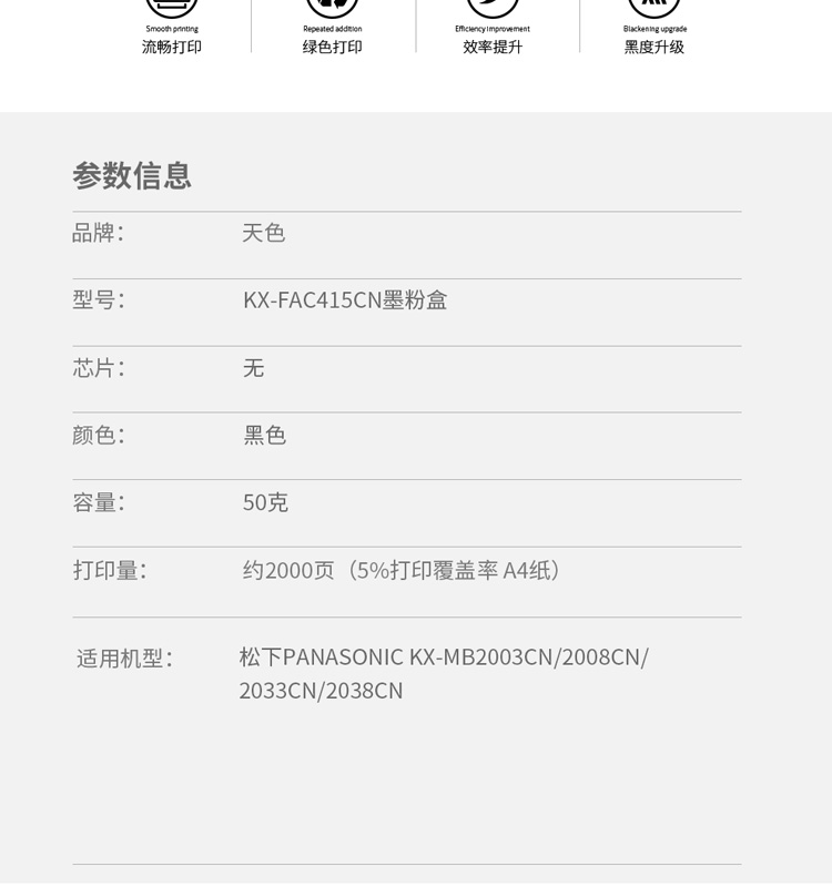 > 办公耗材 复印纸 硒鼓 > 打印耗材 > 硒鼓 > 天色 粉盒 FAC415CN (适用于 PanasonicKX-MB2003CN/2008CN/2033CN)阳光旗舰版 Z| 产品名称 : | 天色 粉盒 FAC415CN (适用于 PanasonicKX-MB2003CN/2008CN/2033CN)阳光旗舰版 Z |