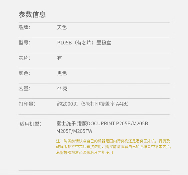> 办公耗材 复印纸 硒鼓 > 打印耗材 > 硒鼓 > 天色 粉盒 P105B有芯片 (适用于 XeroxP105B/M105B/P205B/M205B/P158BM158B)阳光旗舰版 Z| 产品名称 : | 天色 粉盒 P105B有芯片 (适用于 XeroxP105B/M105B/P205B/M205B/P158BM158B)阳光旗舰版 Z |