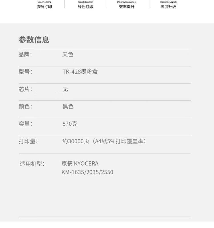| 产品名称 : | 天色 粉盒 TK428 (适用于 KyoceraKM-1635/2035/2550)阳光旗舰版 Z |