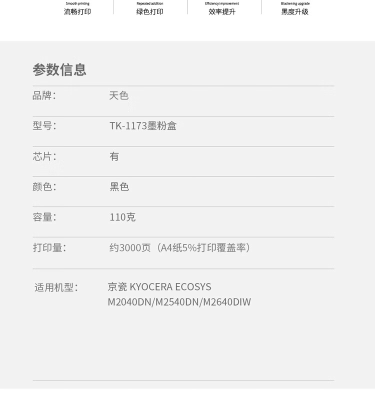 | 产品名称 : | 天色 粉盒 TK1173(260g)(适用于 Eyocera ECOSYS M2040dn/M2540dn)阳光旗舰版 Z |