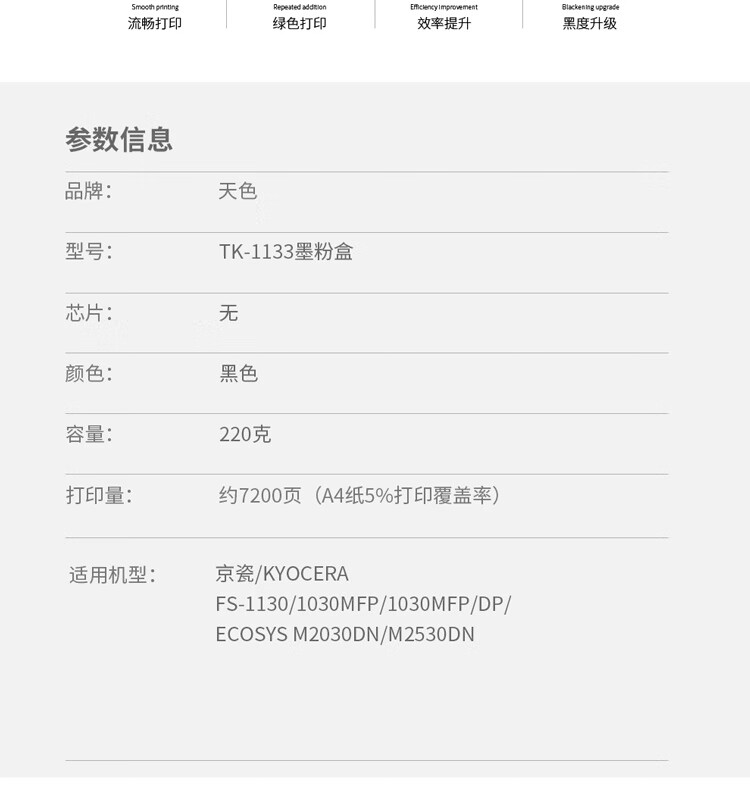 | 产品名称 : | 天色 粉盒 TK1133 (适用于 KyoceraFS-1030MFP/1130MFP)阳光旗舰版 Z |