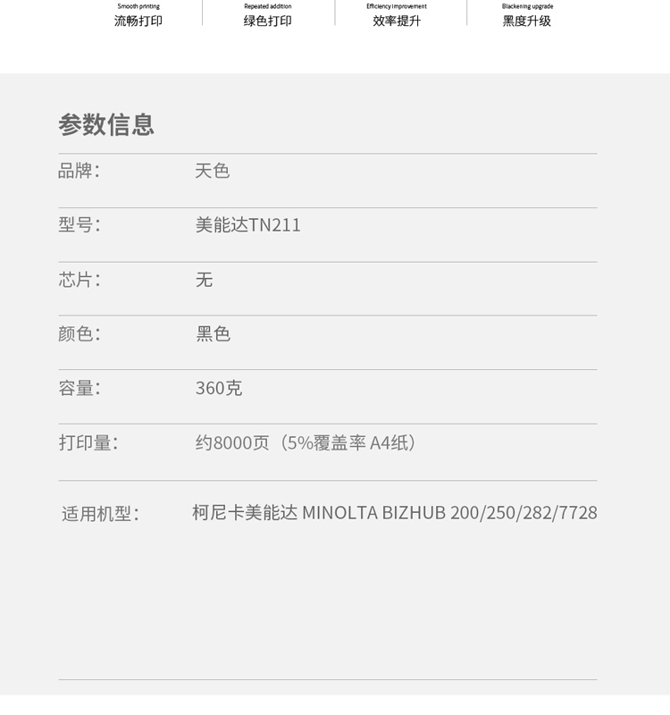 | 产品名称 : | 天色 碳粉 美能达TN211(适用于 Konica Minolta bizhub 200/250)阳光旗舰版 Z |