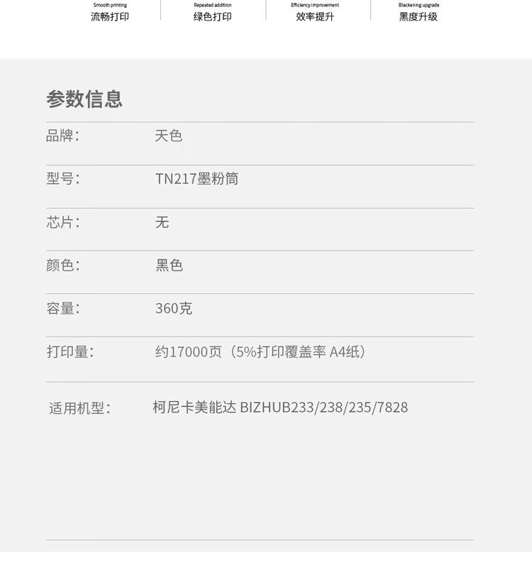 | 产品名称 : | 天色 碳粉 TN217(适用于 KonicaMinoltaBH223/283/7828)阳光旗舰版 Z |