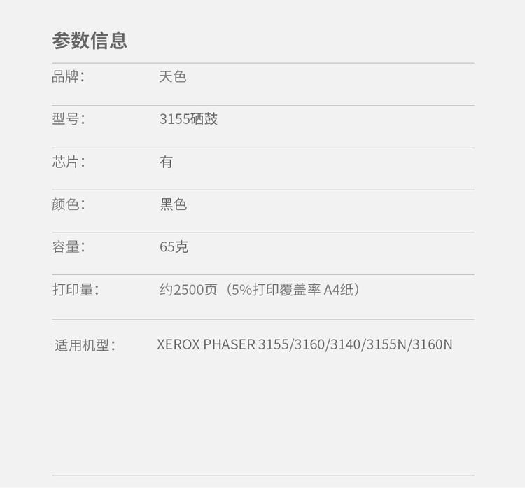 | 产品名称 : | 天色 硒鼓 3155 易加版(适用于 XeroxPhasep3155/3160/3140)阳光旗舰版 |