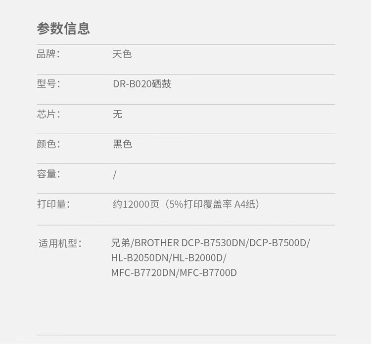 > 办公耗材 复印纸 硒鼓 > 打印耗材 > 硒鼓 > 天色 鼓架 兼容兄弟 DR-B020(适用于 Brother 7535dw/7520dw/7530dn/7500d/2050dn)阳光旗舰版| 产品名称 : | 天色 鼓架 兼容兄弟 DR-B020(适用于 Brother 7535dw/7520dw/7530dn/7500d/2050dn)阳光旗舰版 |