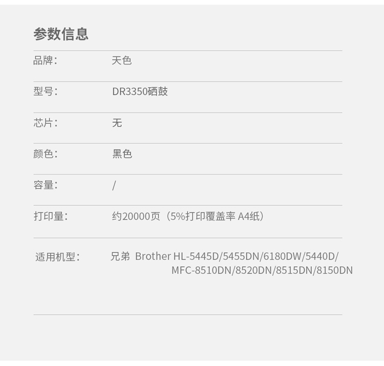 > 办公耗材 复印纸 硒鼓 > 打印耗材 > 硒鼓 > 天色 硒鼓 DR3350 (适用于 BrotherHL-3335/6180dw/5450dn/HL-5440D/mfc8510dn)阳光旗舰版| 产品名称 : | 天色 硒鼓 DR3350 (适用于 BrotherHL-3335/6180dw/5450dn/HL-5440D/mfc8510dn)阳光旗舰版 |