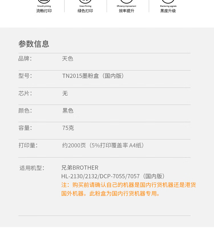 | 产品名称 : | 天色 粉盒 TN2015 国内版(适用于 BrotherHL-2130/2132/DCP-7055)阳光旗舰版 |
