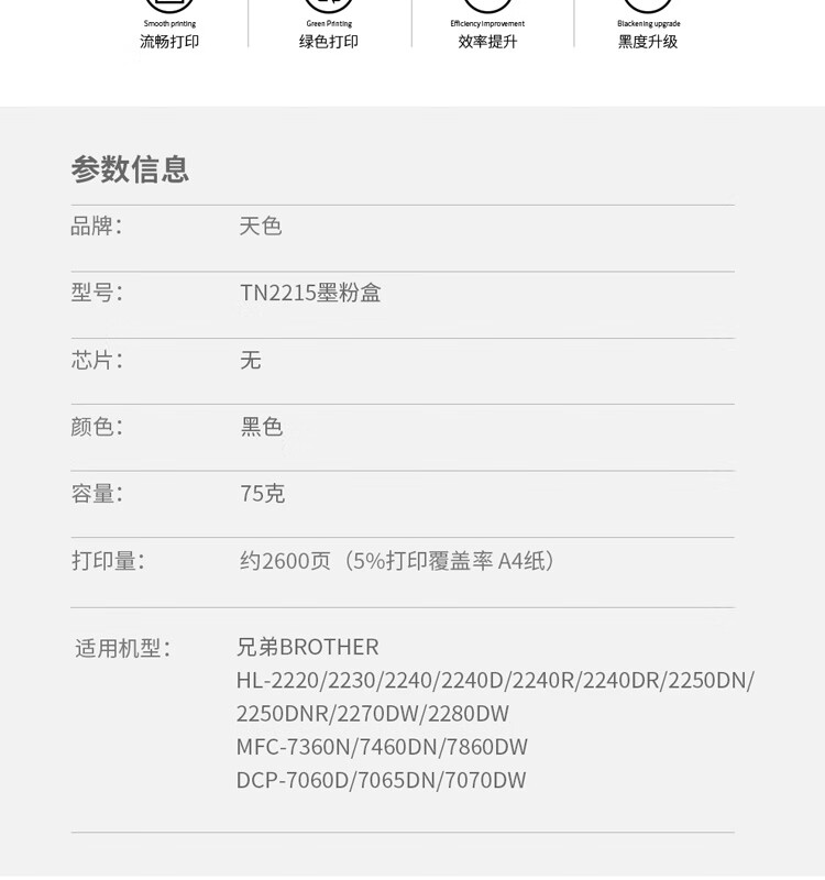 > 办公耗材 复印纸 硒鼓 > 打印耗材 > 硒鼓 > 天色 粉盒 TN2215 (适用于 BrotherHL-2240/2250/2220/2230/2270/2280/)阳光旗舰版| 产品名称 : | 天色 粉盒 TN2215 (适用于 BrotherHL-2240/2250/2220/2230/2270/2280/)阳光旗舰版 |